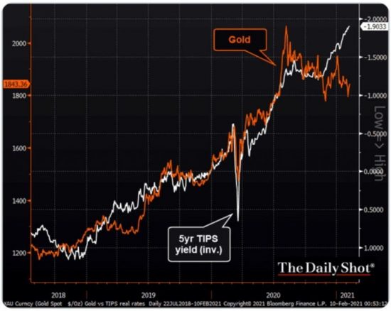 • La faiblesse de l’or est-elle temporaire ? Si la corrélation étroite entre l’or et les bons du Trésor sur 5 ans protégés contre l’inflation (TIPS) devait se rétablir, l’or serait déjà autour de 2.000 $ l’once. Voir le graphique ci-dessous de The Daily Shot.