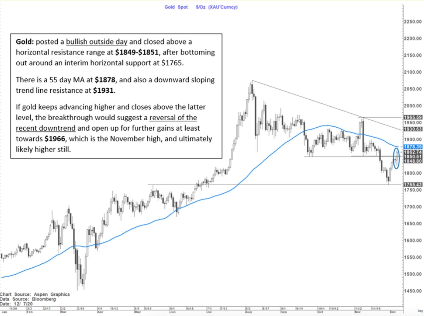 • D’un point de vue technique, Tom Fitzpatrick explique que le prochain niveau de résistance majeure est à 1.878 $ (moyenne mobile à 55 jours). L’or devra ensuite s’affranchir de la zone des 1.931 $, qui correspond à la ligne de tendance descendante formée par les 2 derniers plus hauts du métal jaune. Si le métal parvient à franchir ces 2 niveaux de résistance, il retestera alors 1.966 $, soit son plus haut de novembre (voir graphique ci-dessous).