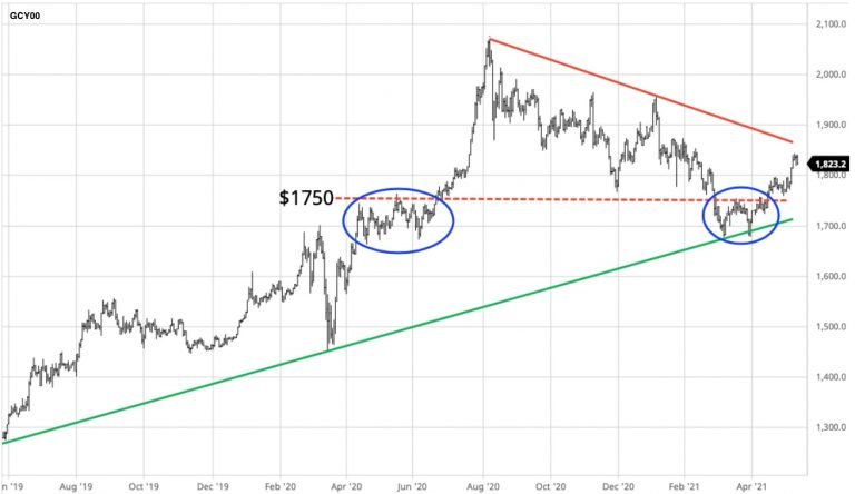 Premièrement, la ligne verte marque la tendance haussière à long terme de l’or, qui a résisté au test de mars. Deuxièmement, le cercle de droite continue de suivre le modèle de l’autre cercle avant le grand bond du prix de l’année dernière. Parfois, l’histoire se répète.