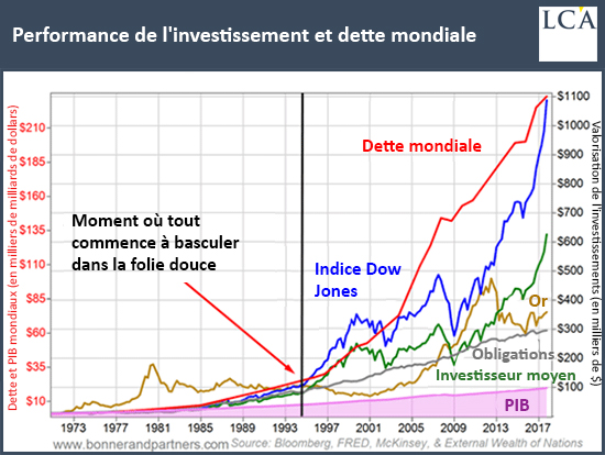 Vous noterez que la dette mondiale n’était que de 30 000 milliards de dollars en 1994. A présent, elle se monte à 230 000 milliards de dollars. Ces 200 000 milliards de dollars de crédit supplémentaire sont probablement le tourbillon qui a envoyé les valeurs dans la stratosphère, dans le haut du graphique à droite.