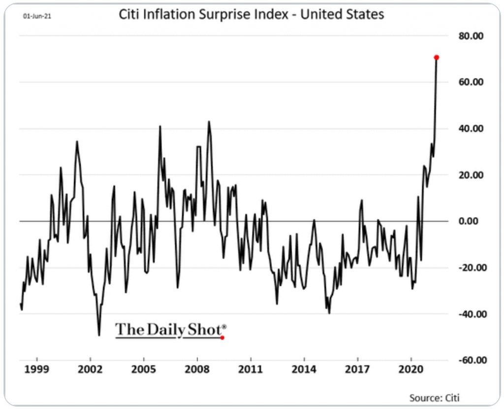 Le Citi Inflation Surprise Index semble corroborer les propos de Fink : la poursuite de la hausse des prix prend la majorité des investisseurs par surprise. Cet indice n’a jamais été aussi élevé depuis sa création, et d’une énorme marge :