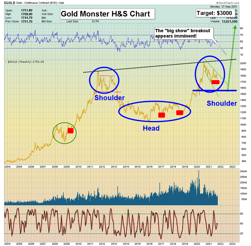 Voyons désormais le graphique à long terme de l’or. Notez l’énorme modèle de continuation haussier (figure tête et épaules inversée) qui se dessine.