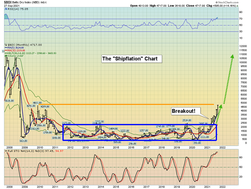 Comme prévu, les démocrates américains n’ont pas continué d’aider les citoyens en difficulté, malgré les promesses. Simultanément, certains blocages de production et logistiques, notamment sur le marché du bois, ont été résolus. En bref, l’inflation a temporairement atteint un plafond, mais elle n’a pas diminué. Elles semblent désormais se consolider. L’étonnant graphique mettant en exergue la « shipflation » du Baltic Dry Index.