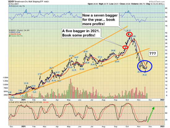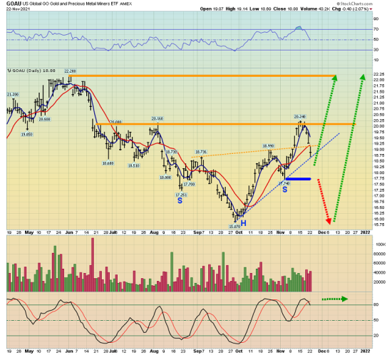 Les investisseurs devraient utiliser le plus bas de l’épaule droite de 17,74 $ comme point de repère. Si le GOAU reste au-dessus de ce niveau, ce qui se passe n’est probablement qu’une simple expansion du modèle tête et épaules inversées. L’épaule droite pourrait alors se former pour préparer une hausse spectaculaire pile-poil pour le début de l’année prochaine. »